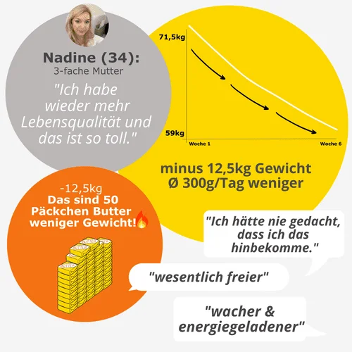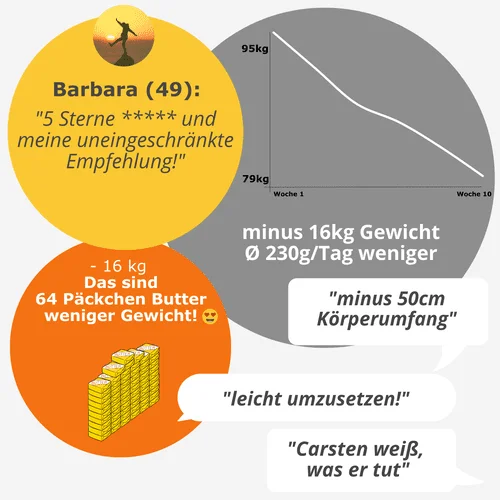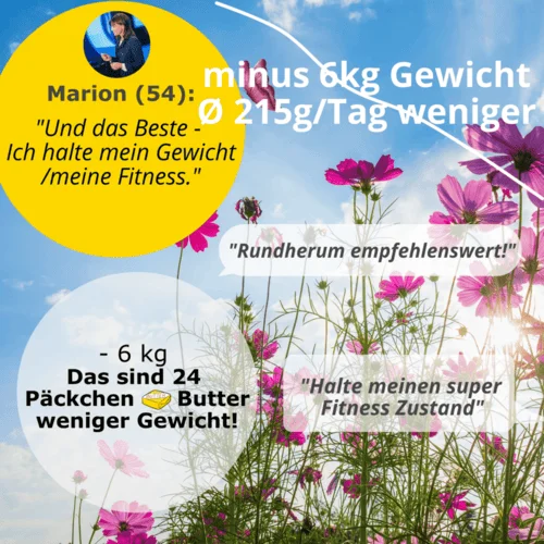 Ergebnis: 250–400 g Gewichtsverlust pro Tag – also rund ein „Päckchen Butter“ täglich weniger, garantiert!