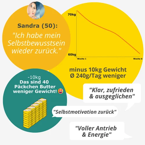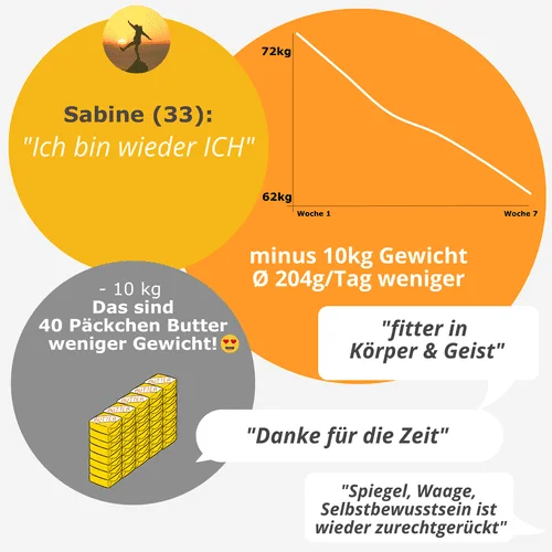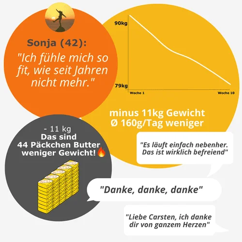 Nach 10 Wochen habe ich (39, weiblich) nicht nur mehr als 10% Körpergewicht verloren, sondern bin vor allem voller Energie, Power und Lebensfreude.